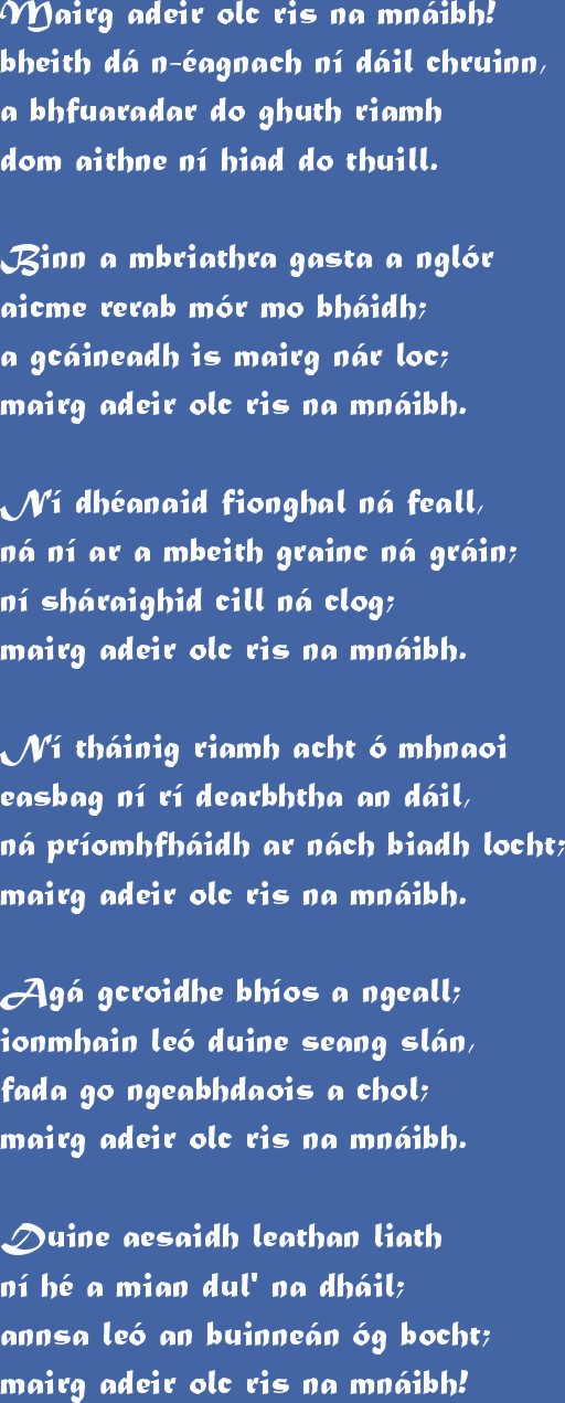 Sein Gedicht "Mairg adeir ole ris na mnáibh!" ist bis